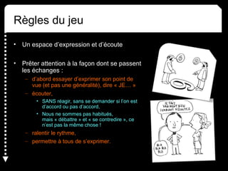 Le document présente un événement appelé « place de la palabre » qui se tient chaque mois à la médiathèque de Nègrepelisse, favorisant l'échange d'idées et la réflexion personnelle sans écrans. Il aborde divers sujets sociaux, économiques et éducatifs tout en promouvant une éducation relationnelle et émotionnelle sans violence envers les enfants. La discussion met l'accent sur l'importance d'une éducation respectueuse et les effets néfastes des châtiments corporels sur le développement des enfants.