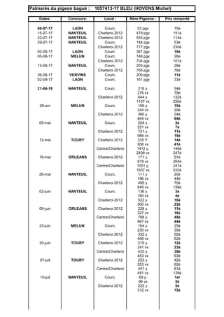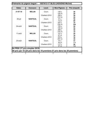 Le document présente le palmarès du pigeon bagué 1057413-17 bleu, appartenant à Michel Hovens, avec les résultats de plusieurs concours locaux entre 2017 et 2018. Il détaille les dates, le nombre de pigeons participants et les positions obtenues dans chaque compétition. Au total, le pigeon a remporté 17 prix simples en 2018, dont 24 dans les 10 premiers.
