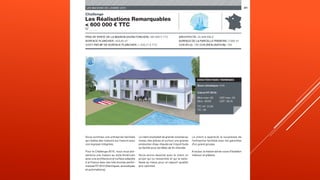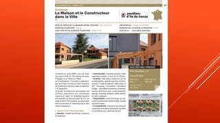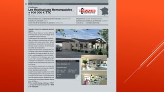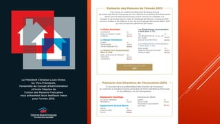 Le document présente les résultats du challenge des maisons de 2015 de l'union des maisons françaises, avec les médailles d'or, d'argent et de bronze attribuées aux lauréats dans différentes catégories. Les catégories incluent la primo accession, le patrimoine, et des réalisations remarquables, avec des distinctions spécifiques pour les projets en dessous et au-dessus de 600 000 euros. La liste des lauréats met en avant les projets remarquables dans le domaine de la construction.