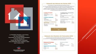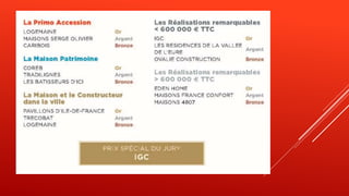 Le document présente les médailles d'or, d'argent et de bronze décernées lors du challenge des maisons de l'année 2015 de l'Union des maisons françaises à Barcelone. Les prix sont attribués dans diverses catégories, y compris 'primo accession', 'maison patrimoine', et 'réalisations remarquables' selon des critères de budgets spécifiques. Les lauréats incluent des projets remarquables tant au-dessus qu'en dessous de 600 000 euros TTC.