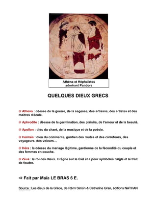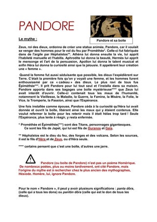 Pandore, créée par les dieux pour punir les hommes, apporta avec elle une boîte mystérieuse contenant tous les maux de l'humanité, recelant également l'espérance. Malgré l'interdiction de la toucher, sa curiosité l'amena à l'ouvrir, libérant ainsi les fléaux sur le monde. Seule l'espérance demeura dans la boîte, offrant ainsi une lueur d'espoir malgré les calamités libérées.