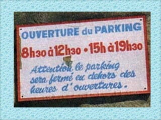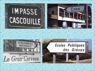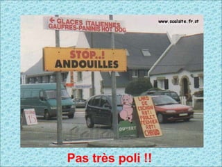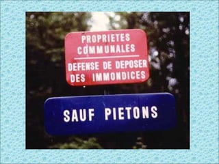 Le document traite de signalisations insolites et de certaines précisions nécessaires du code de la route en France. Il souligne des comportements inappropriés et des limitations d'enseignement. Enfin, il mentionne divers éléments de publicité et insiste sur la nécessité de l'éducation.