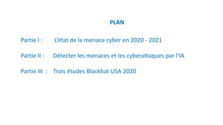 Le document traite de l'évolution des menaces en cybersécurité entre 2020 et 2021, mettant en lumière les impacts dévastateurs des cyberattaques, qui pourraient coûter plus de 6000 milliards de dollars annuels à l'échelle mondiale. Il évoque également l'utilisation croissante de l'intelligence artificielle pour détecter les menaces et l'importance de l'automatisation dans les réponses aux incidents de sécurité. Enfin, trois études de BlackHat USA 2020 soulignent des problématiques de sécurité par conception, d'extraction de modèles et de création de médias synthétiques pour des opérations cybernétiques.