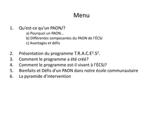 Le document présente le programme PAON, une stratégie de mobilisation et de partenariat entre l'école, la famille et la communauté, axée sur un apprentissage orientant et novateur. Il aborde les différentes composantes du programme, ses bienfaits, ainsi que les défis rencontrés pour maintenir son efficacité dans l'École communautaire Saint-Joseph. Les principaux axes stratégiques incluent le suivi continu des progrès des enfants et l'engagement communautaire.