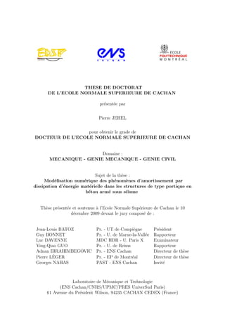 Ce document présente la modélisation numérique des phénomènes d'amortissement par dissipation d'énergie dans des structures en béton armé soumises à un séisme. Il décrit le développement d'un nouvel élément de poutre multifibre, capable de représenter les principales sources de dissipation d'énergie matérielle, ainsi que l'intégration d'un nouveau modèle de béton. Les simulations montrent que cet élément est efficace pour représenter la réponse temporelle non-linéaire d'une structure en béton armé.