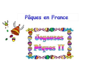 En France, à Pâques, il est traditionnel de manger des œufs, des lapins et des cloches en chocolat, et de cacher des œufs dans le jardin. Les œufs sont souvent décorés et rassemblés dans des paniers. Le document inclut également des exemples de cartes de vœux pour Pâques.