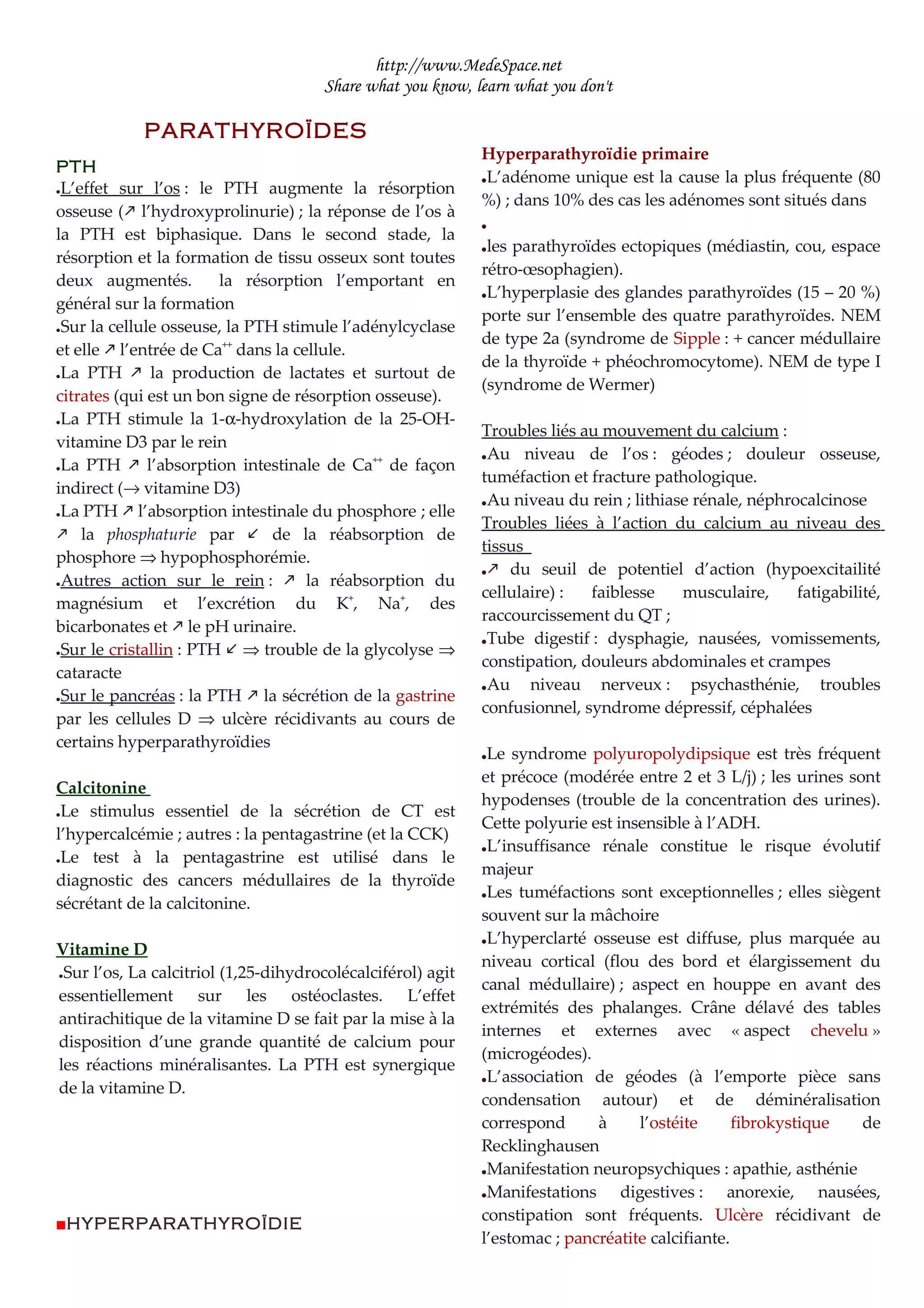 Le document traite des effets des parathyroïdes sur le métabolisme du calcium et du phosphore, ainsi que des manifestations cliniques de l'hyperparathyroïdie. Il souligne le rôle crucial de la PTH (hormone parathyroïdienne) dans la résorption osseuse, l'absorption intestinale de calcium et les conséquences d'un déséquilibre, comme l'hypercalcémie. En outre, il aborde les diagnostics associés et les manifestations spécifiques liées à divers troubles endocriniens.