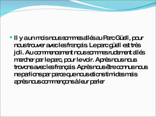 Le document décrit une sortie au Parc Güell où un groupe a rencontré des amis français. Après quelques hésitations, ils ont partagé un repas ensemble et ont visité le parc. Ils envisagent de rendre visite à leurs amis en France l'année suivante pour explorer leur culture et gastronomie.
