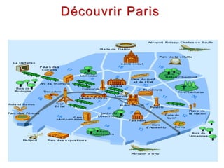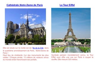 Le document présente divers monuments et attractions emblématiques de Paris, tels que la cathédrale Notre-Dame, la tour Eiffel, et l'arc de triomphe, attirant des millions de visiteurs chaque année. Il décrit également des lieux culturels majeurs comme le musée du Louvre, le centre Pompidou et le musée d'Orsay, tout en mentionnant des sites historiques comme la Conciergerie. Enfin, il évoque des attractions populaires comme le Moulin Rouge et le quartier de Montmartre.