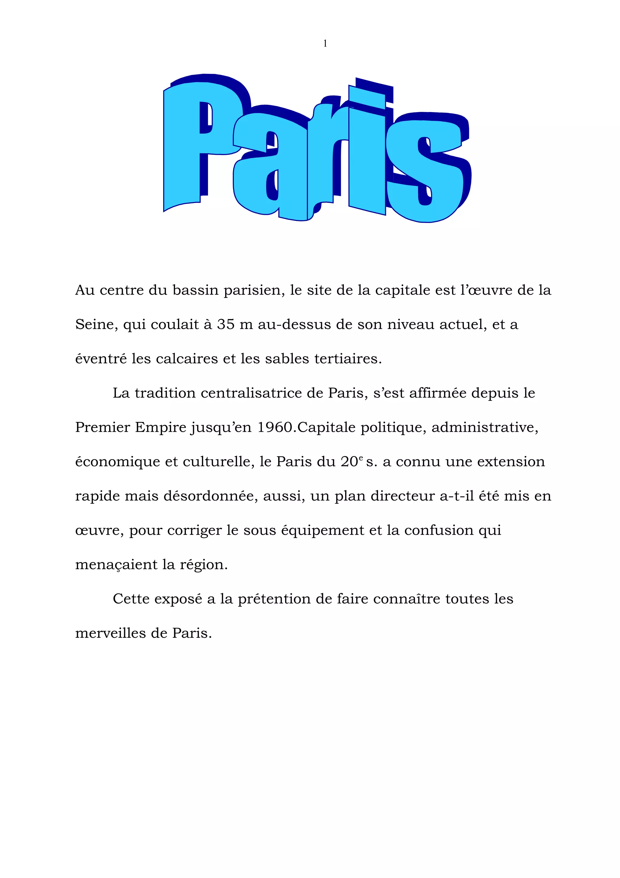 Le document décrit l'évolution historique et architecturale de Paris, mettant en lumière divers monuments tels que la tour Eiffel, le palais de Chaillot et l'arc de triomphe. Il souligne l'importance culturelle, politique et économique de la ville, ainsi que les efforts de planification urbaine pour corriger ses désordres. Enfin, il aborde les jardins, musées et places qui composent le patrimoine architectural de Paris.