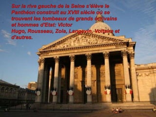 L'Arc de Triomphe se situe au centre de la place Charles-de-Gaulle, abritant le tombeau du soldat inconnu. La cathédrale Notre-Dame de Paris, un exemple majestueux de l'architecture gothique, est située sur l'île de la Cité, tandis que la tour Eiffel, emblème de la ville, se trouve près de la Seine. Paris est également un centre majeur pour la science et l'éducation, avec le quartier Latin étant le cœur des établissements scolaires et de la jeunesse.
