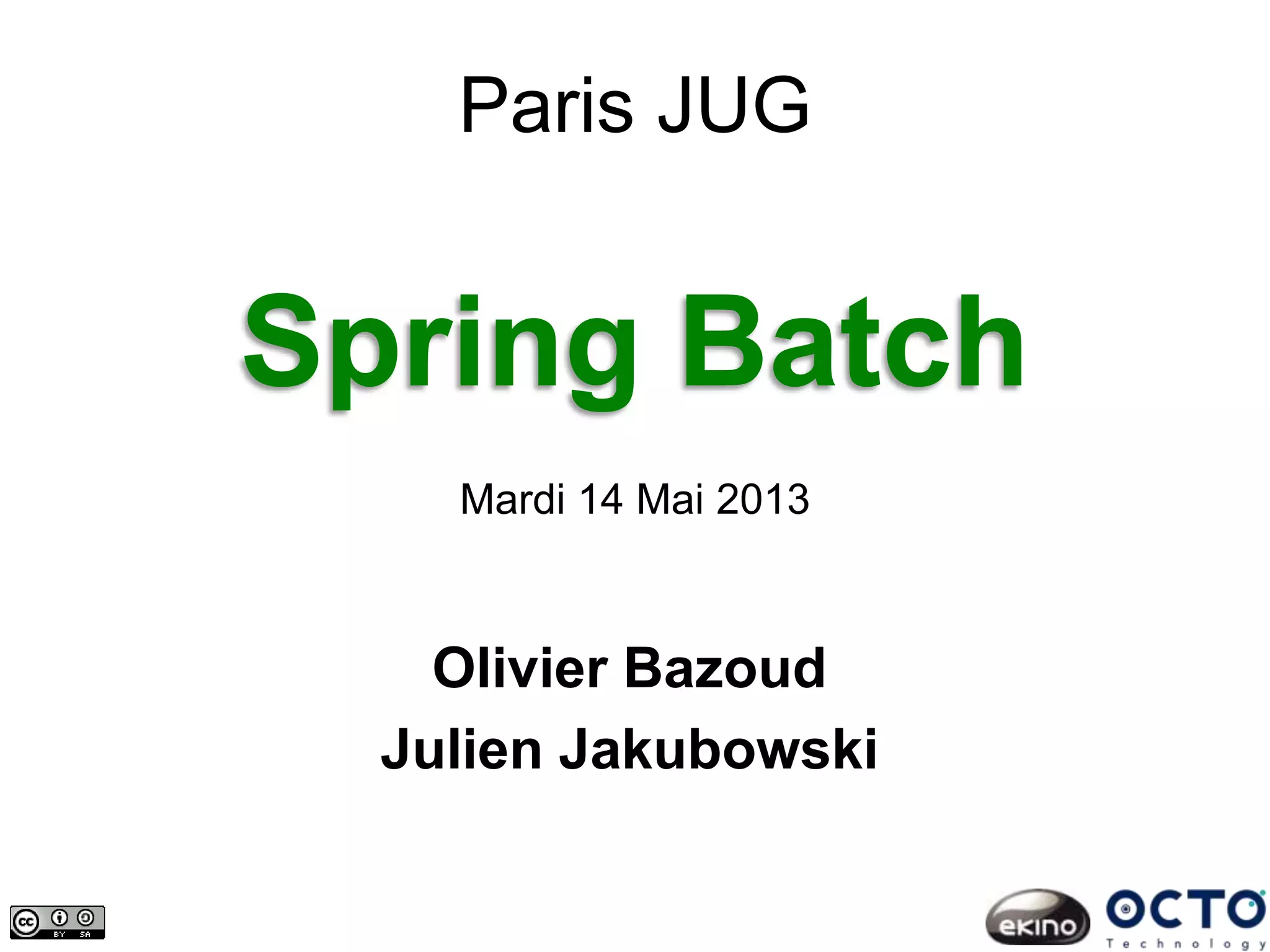 La présentation sur Spring Batch aborde le traitement par lots en Java, mettant en avant ses enjeux, notamment la fiabilité et la maintenabilité. Les intervenants expliquent les concepts clés de Spring Batch, sa configuration, ainsi que ses fonctionnalités avancées telles que la reprise sur erreur et le parallélisme. Des exemples pratiques et des gains de performance par rapport aux systèmes legacy sont également discutés.