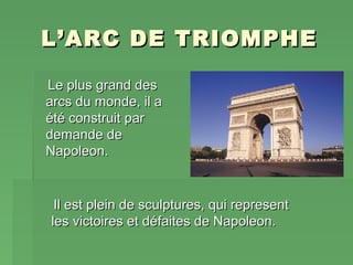 Le document décrit les monuments emblématiques de Paris, notamment l'Arc de Triomphe, la Place de la Concorde, les Champs-Élysées, le Musée du Louvre, le Petit Palais et le Parc Monceau. Chacun de ces sites est présenté avec ses caractéristiques et son histoire. Ensemble, ils témoignent de la richesse culturelle et historique de la ville.