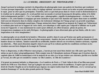 Jean-Paul Barruyer explore la relation entre la lumière et la photographie, soulignant l'évolution de la technique de l'argentique au numérique. Il décrit la quête obsessionnelle des photographes pour capturer la lumière sous ses multiples formes, et comment la technologie moderne permet de rendre l'image fidèle à la vision du photographe. Le diaporama, centré sur Paris, illustre cette passion pour la lumière à travers une abondante collection d'images.
