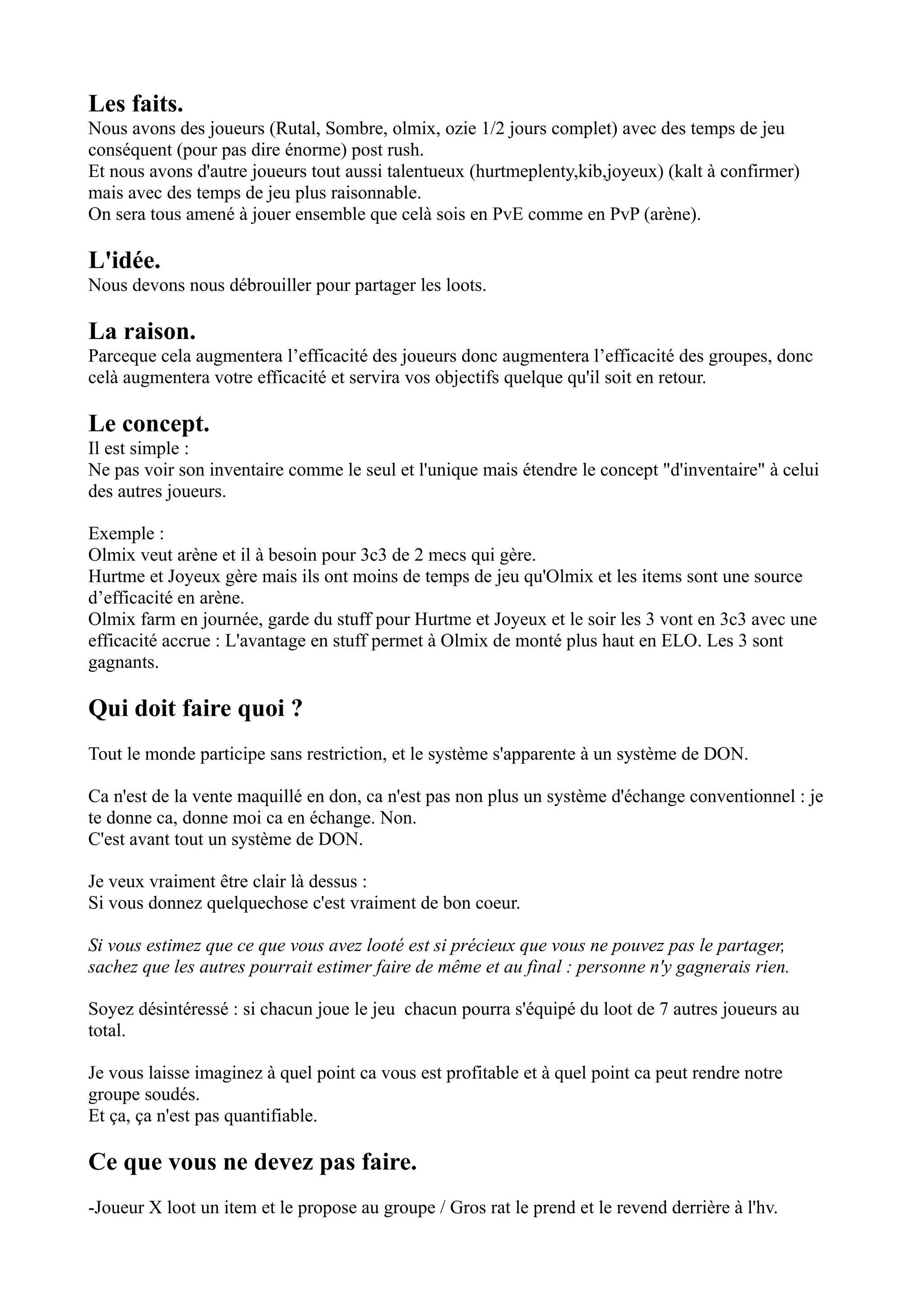 Le document présente un système de partage de loot entre des joueurs afin d'optimiser leur efficacité collective en PvE et PvP. Chaque joueur doit faire preuve de désintéressement en partageant ses objets pour permettre à tous de bénéficier d'un inventaire varié, ce qui favorise la progression du groupe. Des directives sur l'échange d'items, le fonctionnement de groupes et des recommandations pour éviter des comportements cupides sont également fournies.