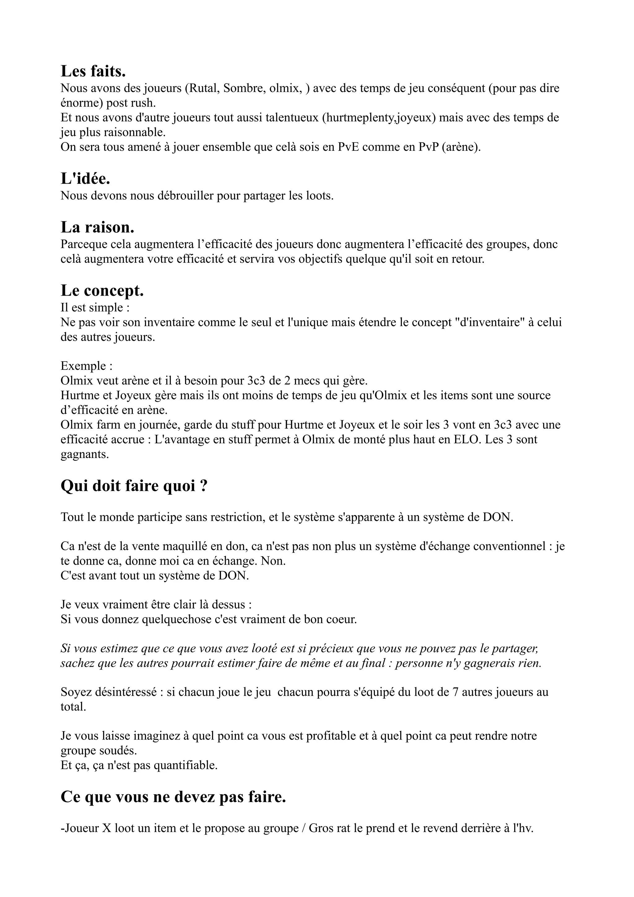 Le document présente un système de partage des loots parmi les joueurs d'une équipe, soulignant l'importance de l'altruisme pour maximiser l'efficacité collective dans les activités PvE et PvP. Chaque joueur est encouragé à donner sans attendre de retour immédiat, ce qui favorise une cohésion de groupe et une progression collective. Enfin, des méthodes de redistribution des équipements et l'organisation de groupes pour le farming sont également proposées pour optimiser la performance de l'équipe.
