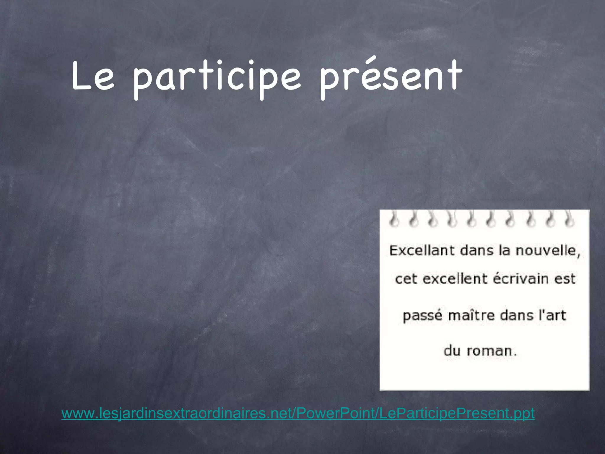 Le document traite du participe présent en français, expliquant comment il se forme et ses usages. Il présente différentes façons d'utiliser le participe présent, notamment en tant que verbe, adjectif verbal ou gérondif, ainsi que des exemples illustratifs. De plus, il aborde la forme composée du participe présent et son utilisation pour exprimer l'antériorité et les circonstances.
