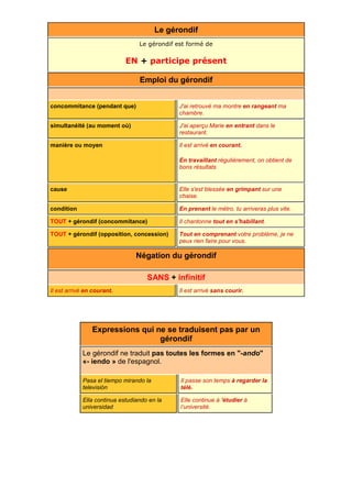 Le document décrit la formation du participe présent et du gérondif en français, incluant des exemples et des usages spécifiques. Il souligne également les différences orthographiques entre le participe présent et les adjectifs verbaux dérivés. Enfin, il présente divers emplois du gérondif, tels que la simultanéité et la façon d'exprimer des conditions.