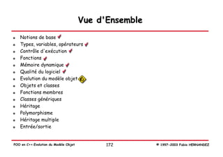 Le document examine l'évolution du modèle objet en programmation orientée objet (POO) et son importance pour le développement de logiciels de qualité. Il aborde les défis liés à la complexité des systèmes logiciels et propose la décomposition orientée objet comme une méthode pour mieux gérer ces défis. Enfin, il décrit les éléments clés du modèle objet, tels que l'abstraction, l'encapsulation, et la hiérarchie, comme des stratégies pour améliorer la conception et l'implémentation de logiciels.