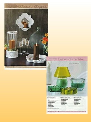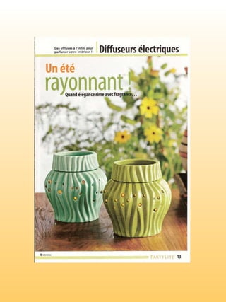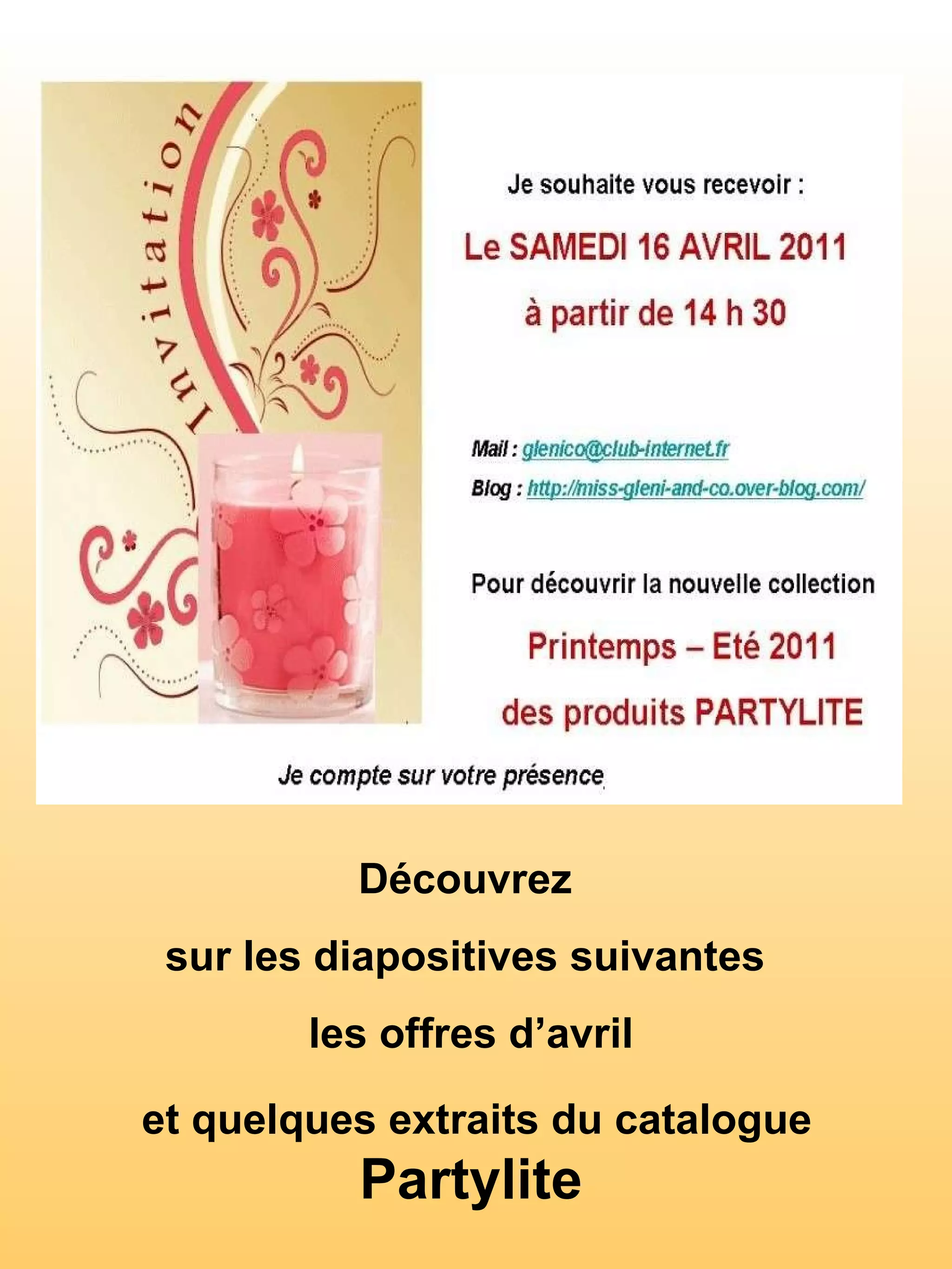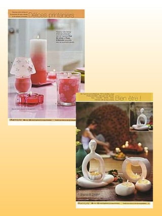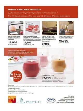 Le document présente des offres spéciales d'avril dans le catalogue Partylite, avec des réductions sur divers ensembles de produits à partir de 15 € d'achat. Les offres incluent des ensembles de bougies et d'encens à prix réduit, ainsi que des promotions sur des trio de mini pots à partir de 30 € d'achat. Chaque ensemble comprend différents articles et senteurs, comme la fleur de cerisier et le tropical.