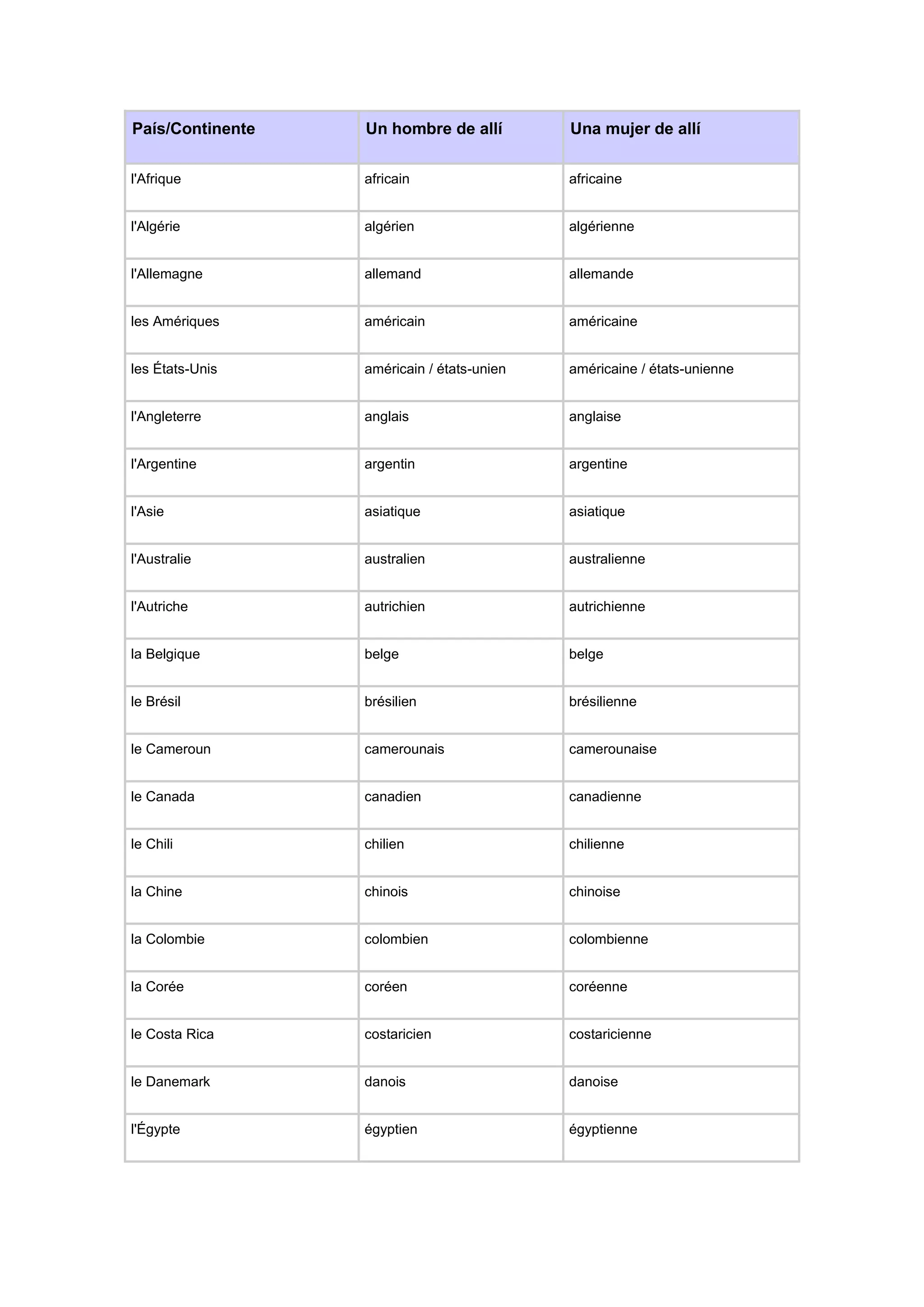 Le document liste divers pays et territoires, ainsi que leurs nationalités correspondantes en français. Chaque entrée comprend le nom du pays et les adjectifs associés décrivant les citoyens ou les citoyennes de ces pays. Il couvre une large gamme de pays d'Afrique, d'Amérique, d'Europe, d'Asie et d'Océanie.