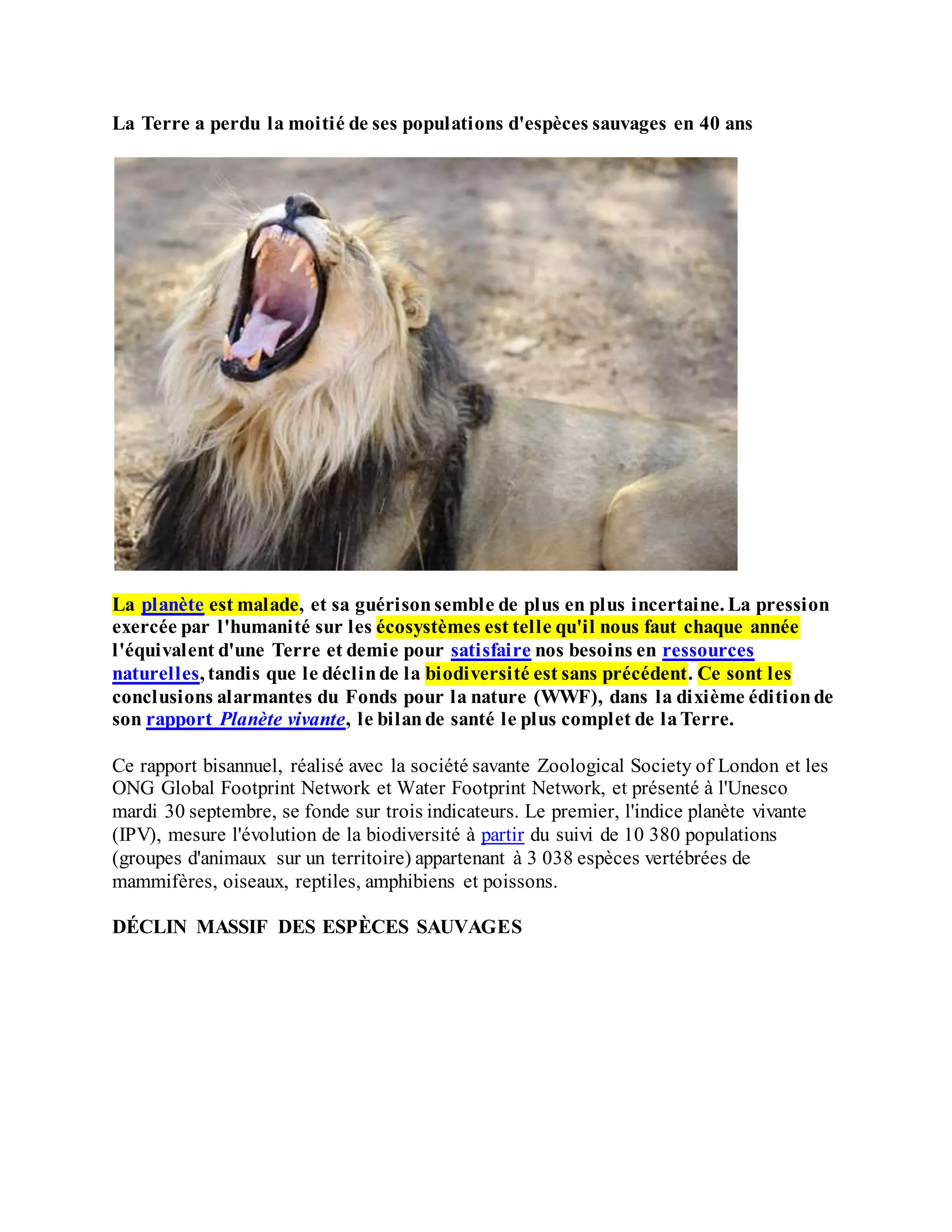 La Terre a perdu la moitié de ses populations d'espèces sauvages en 40 ans, avec un déclin alarmant de la biodiversité, particulièrement dans les régions tropicales. Le WWF souligne que l'humanité utilise l'équivalent de 1,5 Terre par an, dépassant la biocapacité de la planète, ce qui contribue à une crise écologique croissante. L'empreinte écologique et l'empreinte eau révèlent la pression accrue sur les ressources naturelles, exacerbée par la consommation humaine et l'augmentation de la population.
