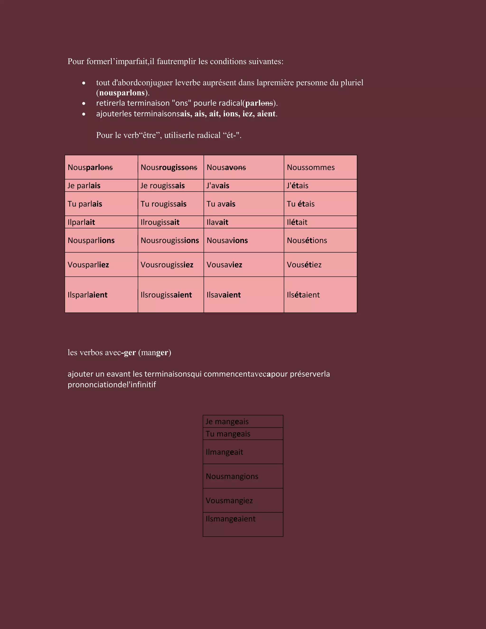 Le document explique comment former l'imparfait en français, en précisant les étapes de conjugaison pour les verbes réguliers et certains verbes irréguliers comme 'être'. Il détaille les terminaisons à ajouter après avoir retiré la terminaison '-ons' du présent et précise les règles pour les verbes en '-ger' et '-cer'. Des exemples de conjugaison pour plusieurs verbes illustrent ces règles.