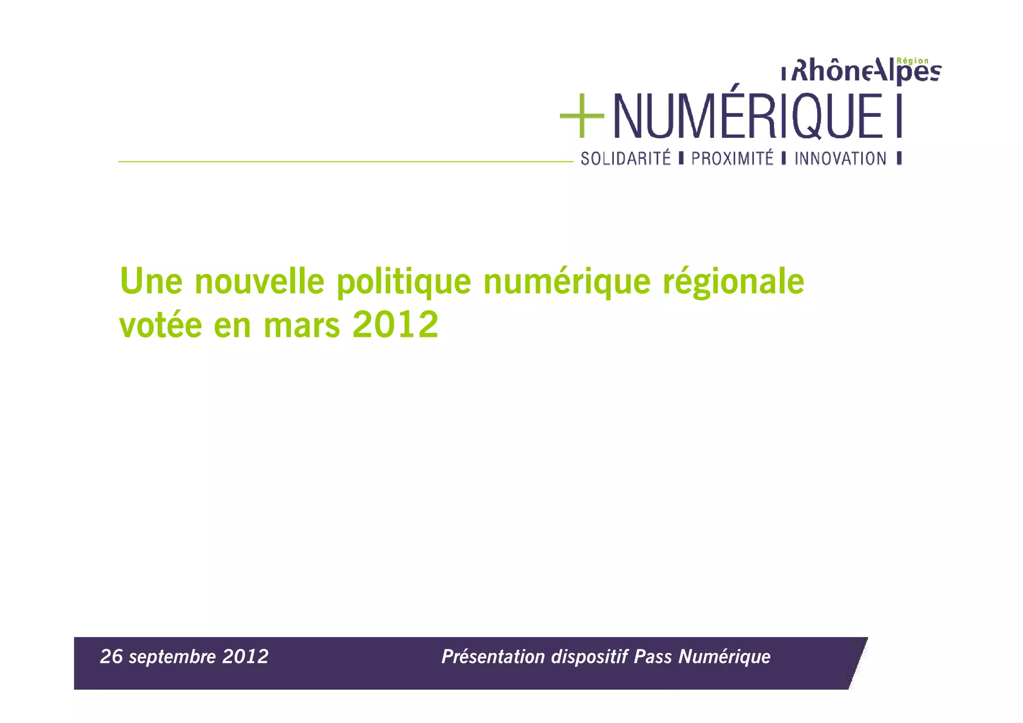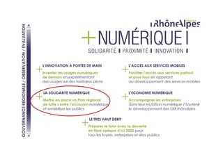 Le document présente une nouvelle politique numérique régionale en Rhône-Alpes, visant à lutter contre l'exclusion numérique en développant les compétences numériques des populations vulnérables. Il décrit le dispositif 'pass numérique', permettant aux citoyens d'acquérir des compétences de base par le biais de projets collectifs et d'accompagnement. Les objectifs incluent l'éducation au numérique et un budget prévisionnel de 350k€ sur deux ans pour financer ces initiatives.