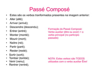 Le document traite de la formation du passé composé en français, en précisant l'utilisation des verbes avec l'auxiliaire 'être' et 'avoir'. Il liste des verbes conjugués au passé composé et fournit également du vocabulaire lié aux activités sportives et de loisirs. Ces informations sont essentielles pour l'apprentissage de la conjugaison et du vocabulaire français.