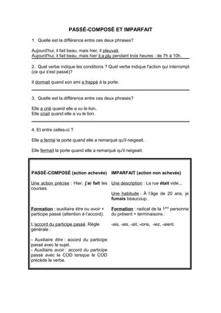 Le document compare le passé-composé et l'imparfait en soulignant leurs différences d'utilisation et de formation. Il explique que le passé-composé est utilisé pour des actions achevées, tandis que l'imparfait décrit des actions non achevées ou des habitudes. Des exemples illustrent les distinctions entre ces temps verbaux et les règles d'accord du participe passé.