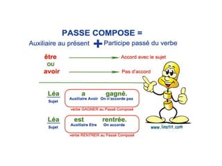 Le passé composé est formé d'un auxiliaire (être ou avoir) et du participe passé d'un verbe, utilisé pour exprimer des actions ponctuelles, finies et passées. L'accord du participe passé dépend de l'auxiliaire utilisé, avec des règles spécifiques pour être et avoir, ainsi que des exceptions pour certains verbes. Le document inclut des exemples pratiques et des exercices pour aider à la compréhension et à la maîtrise du passé composé.
