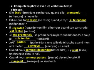 Le document explique la différence entre le passé composé et l'imparfait en français, en fournissant des indicateurs temporels pour chaque temps. Il propose également des exercices d'écoute et de complétion de phrases pour pratiquer l'utilisation correcte des verbes dans ces temps. Enfin, il comprend des exemples pratiques de mise en situation avec des verbes à conjuguer.