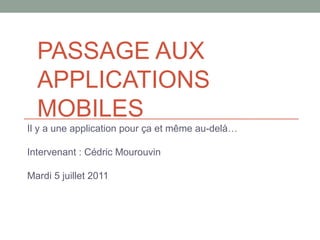 Le document traite des applications mobiles, y compris des applications natives et du développement web pour mobile, en soulignant l'importance croissante des usages mobiles. Il présente également les avantages et inconvénients des différentes approches de développement, notamment la notion de 'write once, run anywhere' pour les applications hybrides. Enfin, il recommande des solutions basées sur l'ergonomie et la maintenabilité tout en fournissant des liens vers des ressources et études pertinentes.