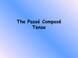 Le document explique le temps passé composé en français, qui est formé de deux parties : une forme du verbe 'avoir' au présent et le participe passé du verbe. Il détaille également comment former le participe passé en changeant les terminaisons des verbes. Des exemples illustrent l'utilisation de ce temps avec différents verbes en français.