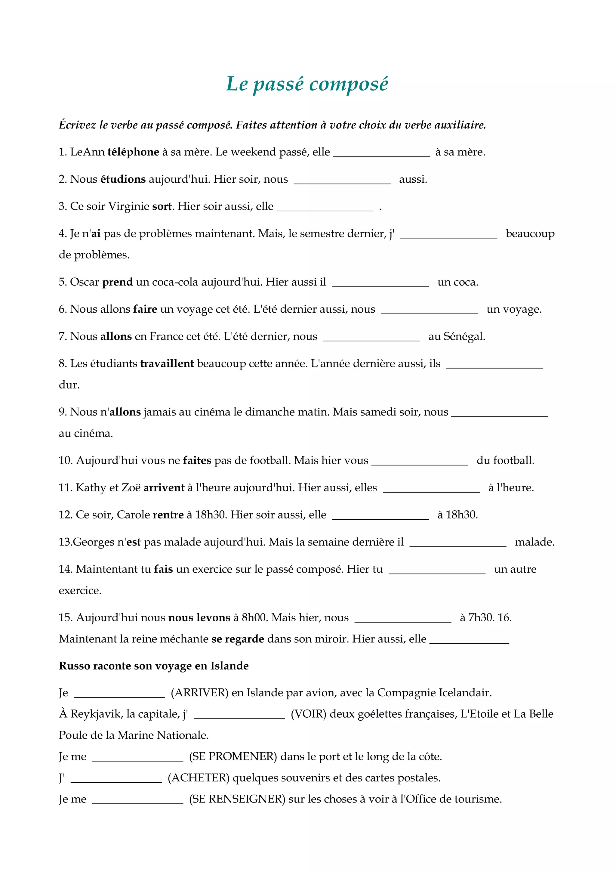 Le document présente une série d'exercices de français axés sur la conjugaison des verbes au passé composé. Il invite les lecteurs à compléter des phrases en choisissant les verbes appropriés et en utilisant les participes passés. Les exemples couvrent des situations variées, facilitant ainsi la compréhension et la maîtrise de cette forme verbale.