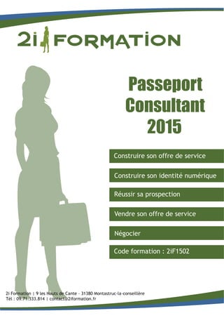 Le document présente une formation intitulée 'Passeport Consultant' qui vise à aider les consultants à construire leur offre de service, leur identité numérique et à réussir leur prospection. Le programme couvre divers aspects tels que la communication interpersonnelle, la négociation, ainsi que l'utilisation des réseaux sociaux professionnels. Il inclut également des informations pratiques sur la responsabilité et la propriété intellectuelle des contenus de formation.