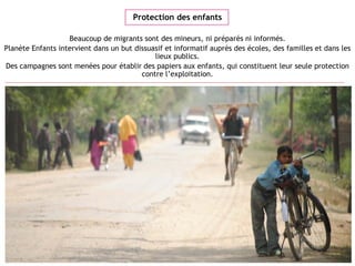 Planète Enfants s'engage à informer et protéger les enfants migrants, souvent vulnérables, à travers des campagnes d'information et des bureaux d'assistance. L'organisation forme des bénévoles pour orienter les migrants et sensibiliser le grand public sur les enjeux de la migration. Elle propose aussi des alternatives de revenus pour les femmes vulnérables et a mis en place un centre résidentiel pour les victimes d'exploitation.