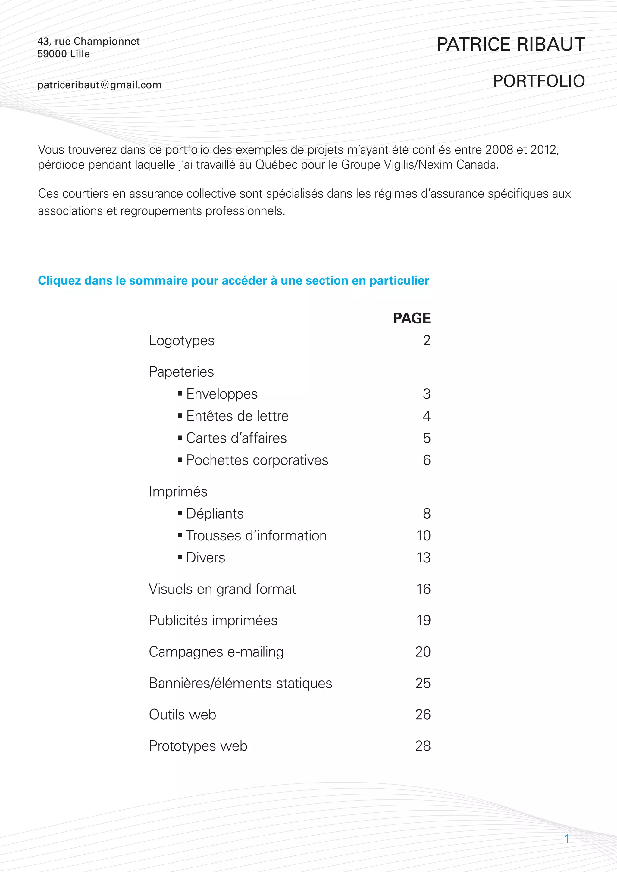 Le document présente un portfolio de projets réalisés par Patrice Ribaut entre 2008 et 2012, principalement pour le groupe Vigilis/Nexim Canada, spécialisés dans les régimes d'assurance collective. Il contient des exemples de logotypes, papeteries et brochures destinées à promouvoir divers régimes d'assurance. Le portfolio s'adresse notamment à des associations, regroupements professionnels et étudiants étrangers à Québec.