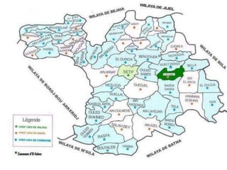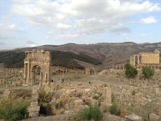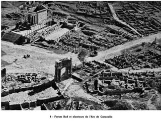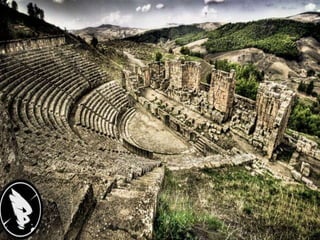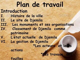 Le document présente l'histoire, les monuments et la gestion de Djemila, un site romain classé au patrimoine mondial de l'humanité. Fondée à la fin du Ier siècle, Djemila a connu un développement significatif sous différents empereurs romains avant de tomber en désuétude, avec un regain d'intérêt lors de fouilles archéologiques au XXe siècle. Aujourd'hui, la protection et la gestion de ce patrimoine sont assurées par des acteurs nationaux et internationaux, malgré le fait que 40% de la ville reste encore non découvert.