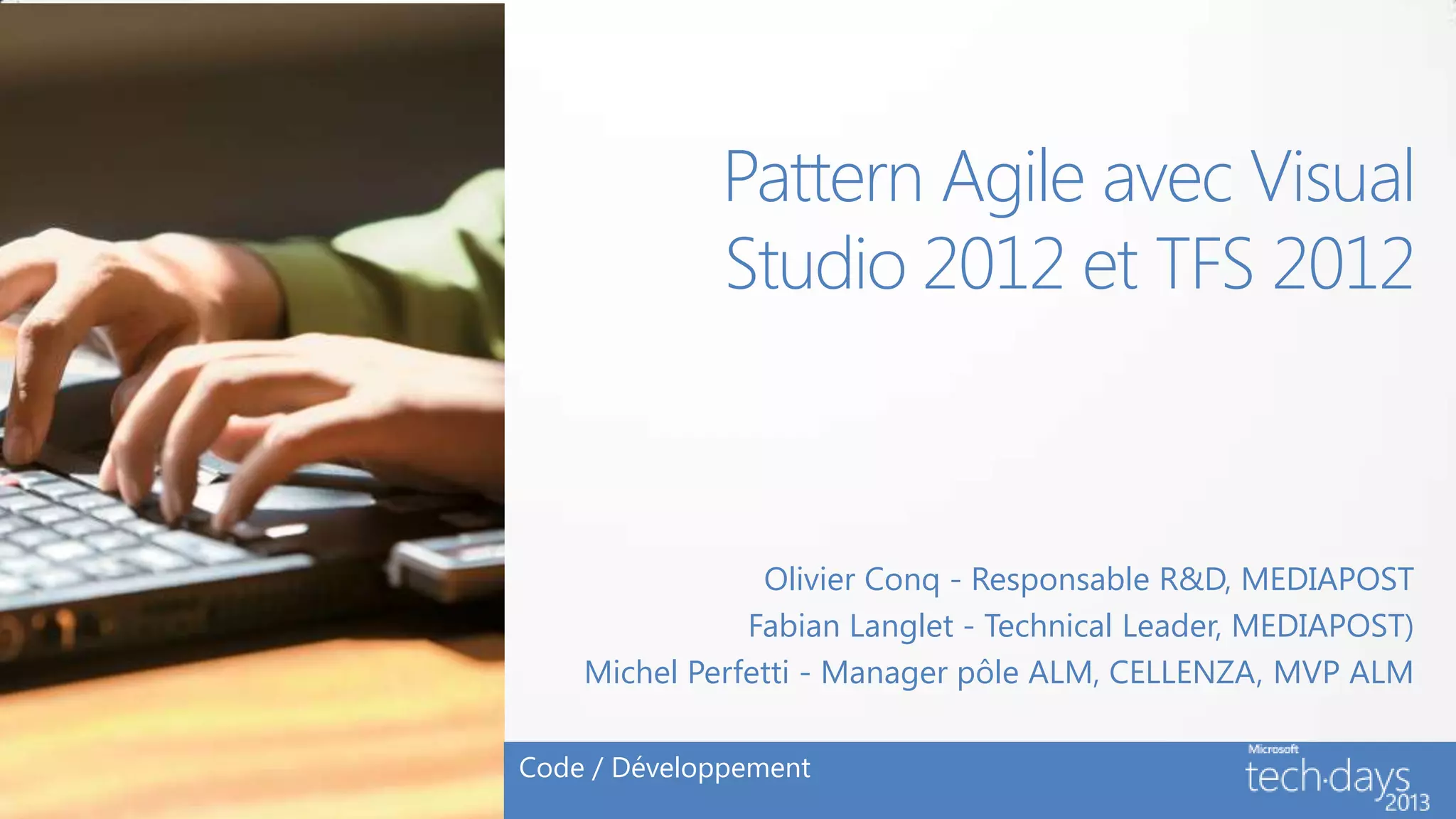 Le document présente l'utilisation des patterns agiles avec Visual Studio 2012 et TFS 2012, illustrée par une démonstration de sprint chez Mediapost. Il détaille l'organisation des équipes agiles, les expériences passées avec des outils de gestion précédents, ainsi que les bénéfices attendus du nouveau système. La collaboration entre les équipes est renforcée grâce à des cérémonies Scrum et des outils intégrés, visant à améliorer la productivité et la qualité des livraisons.