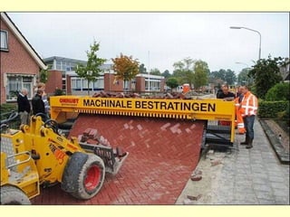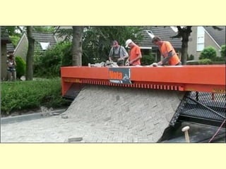Le document décrit l'installation de pavés unis pour le pavage de rues en Allemagne. Cette méthode permet de réduire considérablement le temps d'exécution des travaux. L'exemple évoqué met en lumière son application pour une entrée de garage.