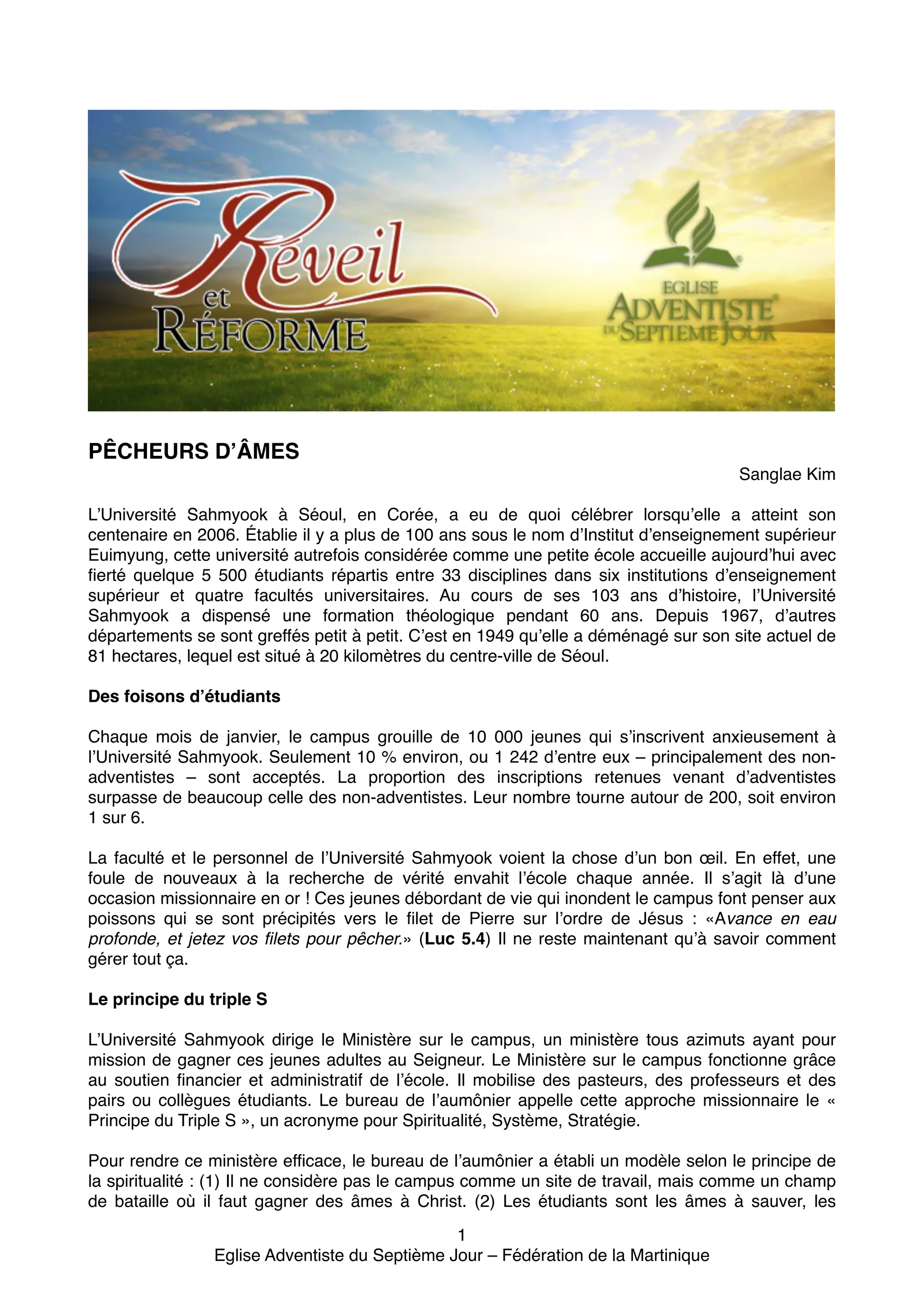 L'université Sahmyook, fondée il y a plus de 100 ans en Corée, accueille aujourd'hui environ 5 500 étudiants et met l'accent sur l'éducation spirituelle tout en intégrant la théologie dans son programme. À travers le programme 'triple S' (spiritualité, système, stratégie), l'université s'efforce de gagner les jeunes à la foi chrétienne, en mobilisant pasteurs, professeurs et étudiants. Les activités religieuses, telles que les cultes, les semaines de prière et les voyages missionnaires, jouent un rôle crucial dans l'engagement spirituel des étudiants, avec des centaines d'entre eux choisissant de se faire baptiser chaque année.