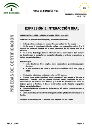 Le document présente les instructions pour un exercice d'expression orale de niveau C1 en français, comprenant un monologue et un dialogue sur des thèmes variés, tels que la désobéissance et les découvertes de la NASA. Les candidats doivent utiliser un vocabulaire approprié et structurer leurs interventions de manière argumentative en engageant une réflexion personnelle. Les règles de préparation et d'évaluation sont également spécifiées, incluant la durée et les restrictions sur la prise de notes.