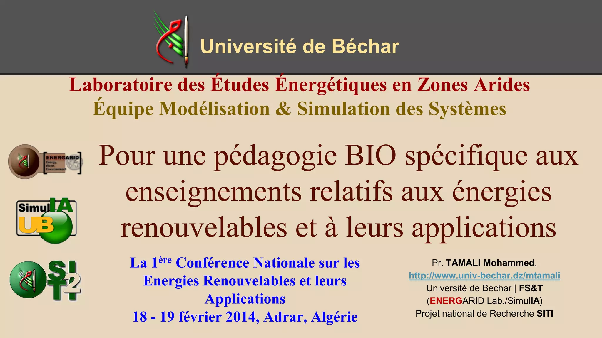 Ce document présente les recherches menées par le laboratoire d'études énergétiques de l'Université de Béchar sur les énergies renouvelables en Algérie, ainsi que l'importance de l'éducation et de la pédagogie dans ce domaine. Il aborde également les défis actuels liés à la production d'énergie, les sources potentielles et les besoins d'investissement pédagogique pour soutenir les projets innovants. Enfin, il met en lumière la nécessité d'une approche méthodologique rigoureuse pour garantir le succès des initiatives en matière d'énergies renouvelables.
