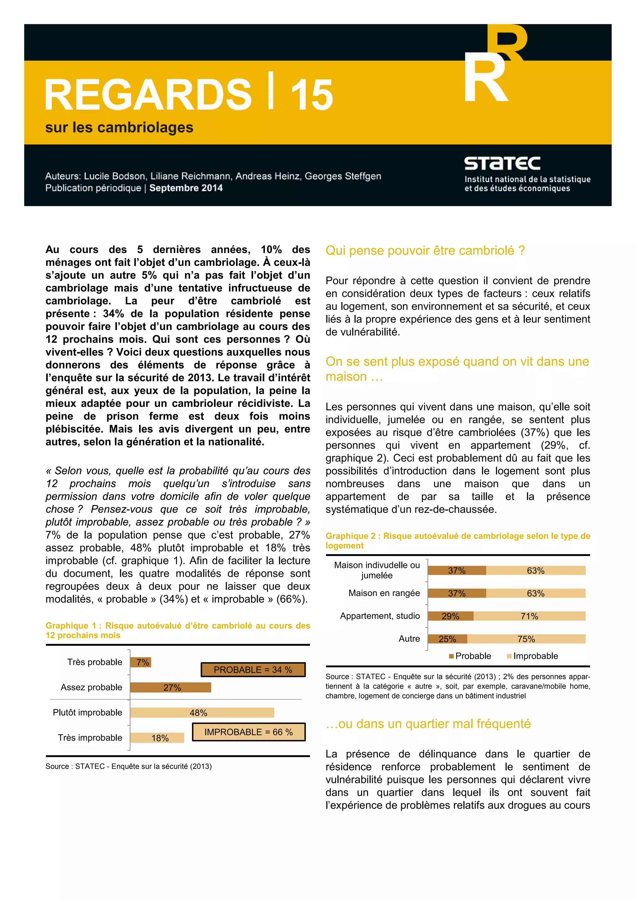 Au cours des cinq dernières années, 10% des ménages ont subi un cambriolage, et 34% des résidents craignent une tentative de cambriolage dans l'année à venir. Les opinions sur les peines à infliger aux récidivistes varient, le travail d'intérêt général étant préféré par 46% de la population, alors que l'enfermement en prison est moins plébiscité. Les facteurs de vulnérabilité incluent le type de logement, l'environnement et l'expérience personnelle, la peur d'être cambriolé augmentant avec l'âge et étant plus présente chez les ménages à faibles revenus.