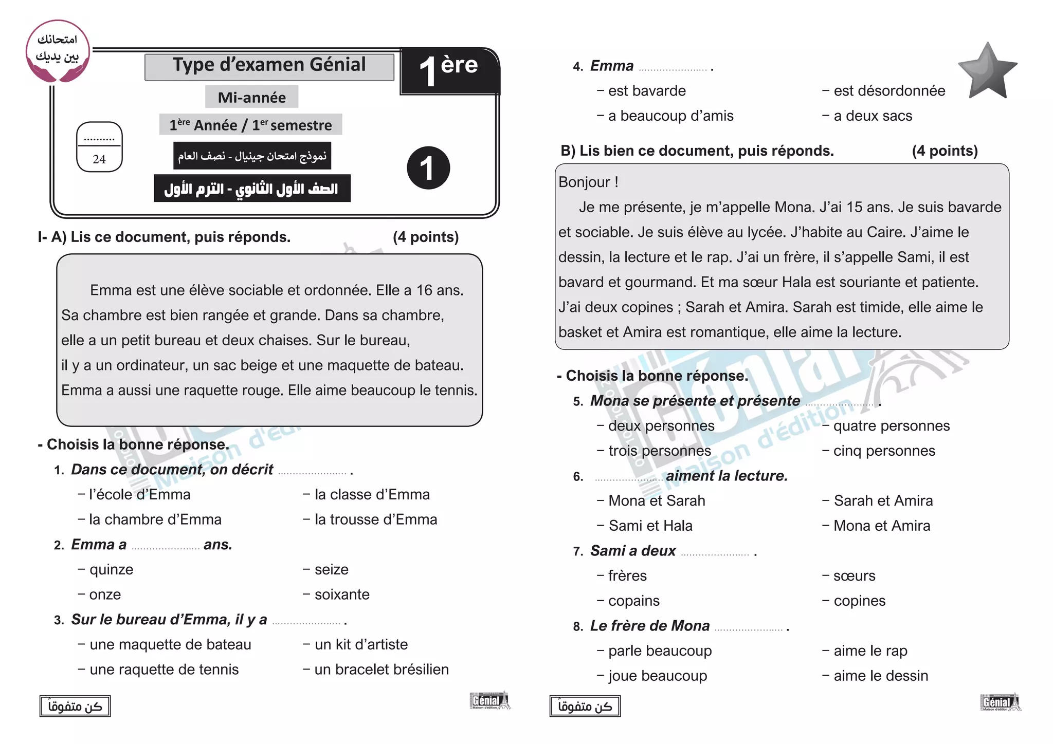 Le document présente des exercices de compréhension écrite basés sur des présentations d'élèves, notamment Emma, Mona, Tamer, Mariam, et Magdi, chacun décrivant leur âge, leurs intérêts, et leurs amis. Les élèves sont évalués par des questions à choix multiples sur les informations données dans leurs descriptions. Chaque section se concentre sur des éléments spécifiques de la langue française, comme le vocabulaire et la grammaire.