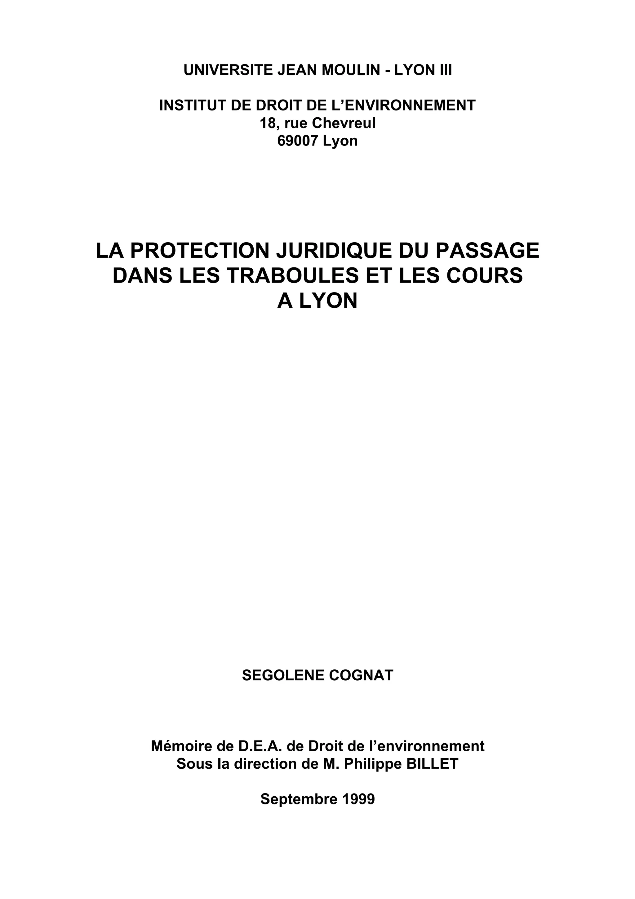 Ce mémoire explore la protection juridique des traboules et cours à Lyon, en examinant leur conservation, leur intégration dans l'urbanisme et leur financement pour la restauration. Il souligne les divergences d'opinion sur la valeur des traboules comme patrimoine culturel et la nécessité d'une reconnaissance légale de leur statut. Enfin, il analyse les voies privées ouvertes à la circulation publique et leur distinction par rapport aux propriétés privées traditionnelles.