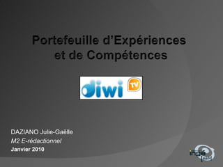 Le document présente le projet de formation de Julie-Gaëlle Daziano dans le cadre de son M2 en e-rédactionnel, détaillant ses choix stratégiques pour s'insérer dans le projet Diwi TV. Elle décrit ses compétences en communication et en organisation d'événements, ainsi que son engagement dans le pôle communication. Les perspectives professionnelles incluent un stage en webmarketing et un perfectionnement en anglais si aucune proposition d'embauche n'est faite.
