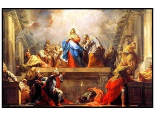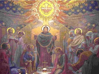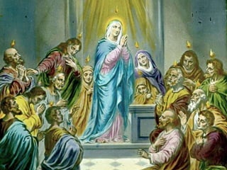 Le diaporama de Jacky Questel célèbre la Pentecôte, soulignant l'envoi de l'Esprit Saint aux disciples comme une promesse divine de force et de joie. Il met en lumière la mission d'évangélisation confiée par Jésus à ses disciples, ainsi que l'importance de la consécration et de la communion dans le processus de devenir membres du corps mystique du Christ. Enfin, le texte évoque la nécessité de s'ouvrir à l'Esprit pour vivre pleinement cette mission d'apôtre et de témoignage.