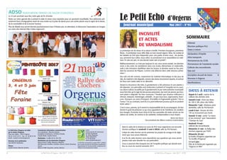 Le Petit Echo d'Orgerus de mai 2017 informe sur les événements de la commune, notamment la reprise de la collecte des déchets verts et diverses activités culturelles. Il soulève également des préoccupations concernant des actes de vandalisme dans les écoles, incitant à une réflexion sur le civisme des jeunes. Des informations pratiques sur la déclaration d'impôts et des permanences sociales sont aussi présentées.